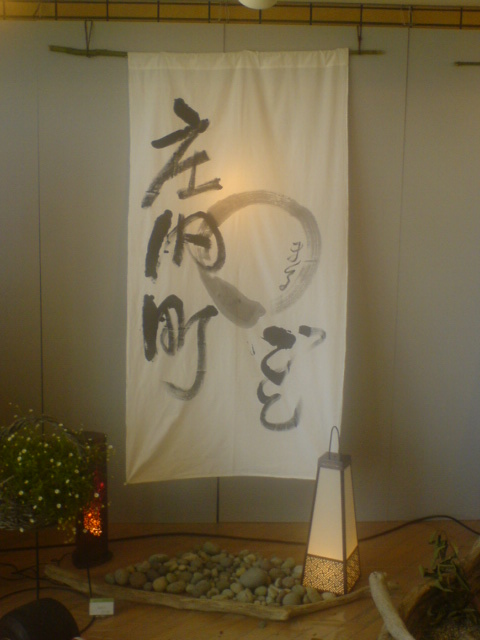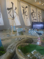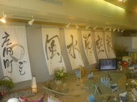 庭石が敷かれ、壁にはイイ感じの大きな暖簾?が。液晶モニターからは立谷沢の清流の映像が涼しそうな音とともに映し出されています。